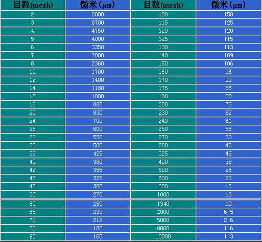 篩網目數與粒徑對照表以及相關知識